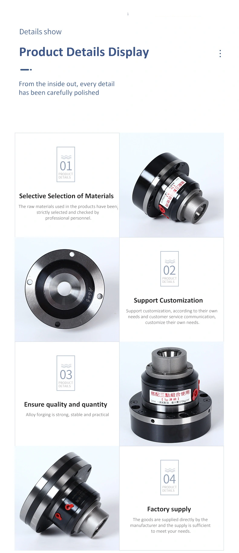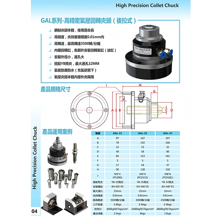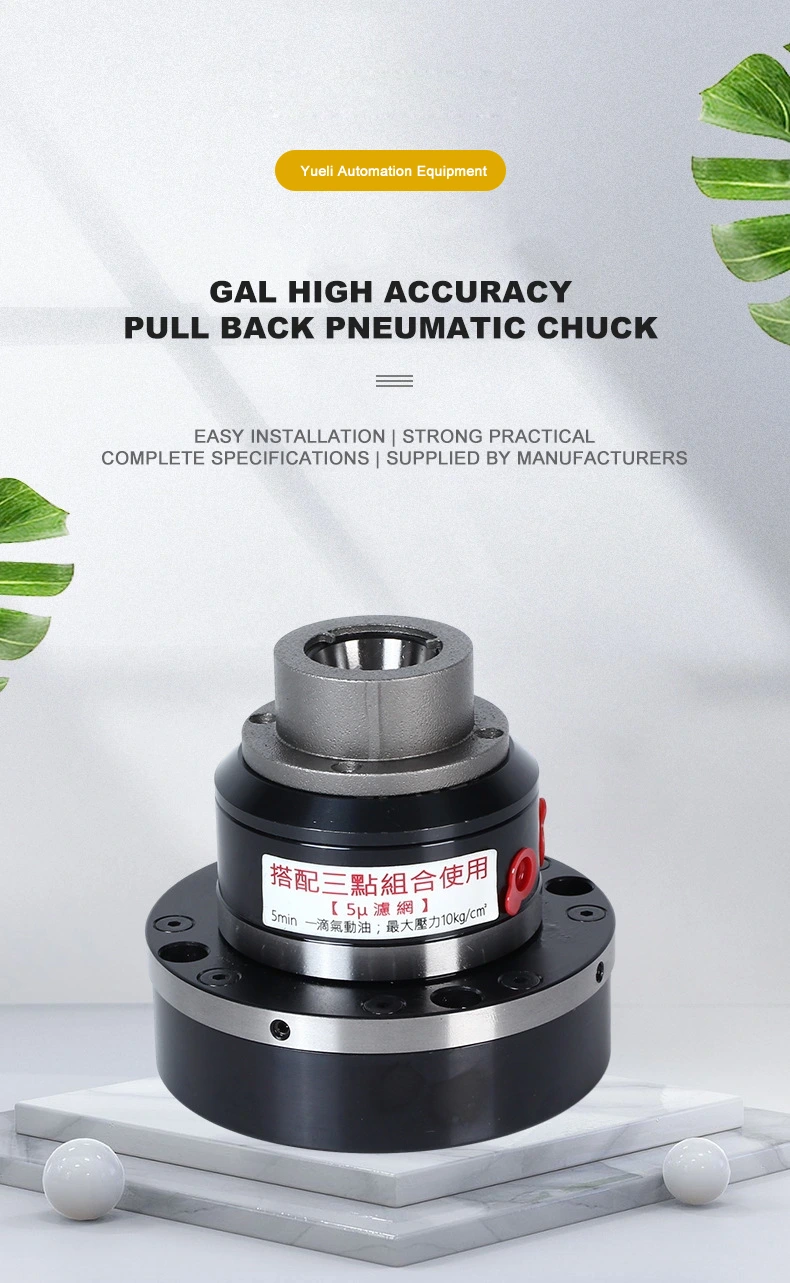 GAL-25 är en höghastighets roterande pneumatisk chuck. Det tillhör en slags pneumatisk chuck, som ofta används i CNC -bearbetning, precisionslipningsmaskin och annan precisionsbearbetningsutrustning, med hög klämningsnoggrannhet, kan uppnå stabil klämma av arbetsstycket, hjälpa automatiskt processprocessprocess